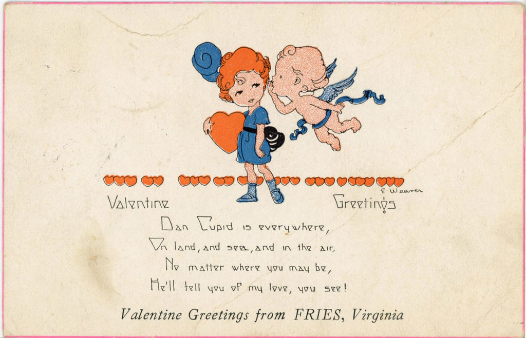 Antique Valentine postcard from the early 1900s featuring a sweet cupid whispering to a rosy-cheeked girl holding a heart. Illustrated by E. Weaver and captioned “Valentine Greetings from Fries, Virginia,” this whimsical Edwardian-era card is perfect for collectors and vintage Valentine décor.