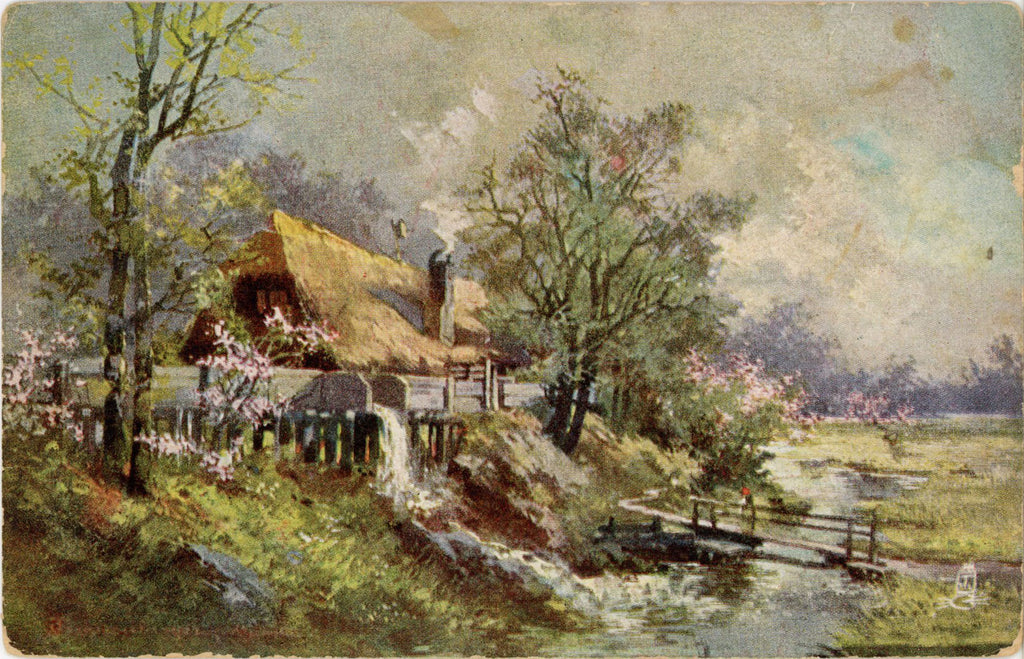 Vintage botanical Oilette postcard featuring a cottage surrounded by flowering trees and picturesque creek. Wayside Sketches Series.