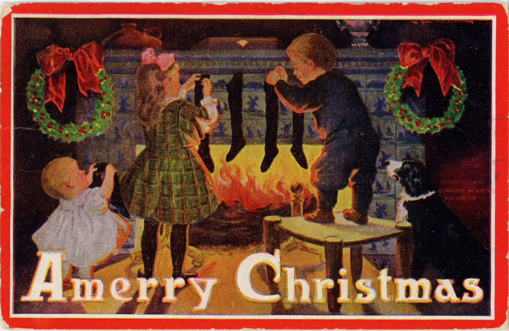 Vintage embossed A Merry Christmas postcard featuring children hanging stockings by the fire.