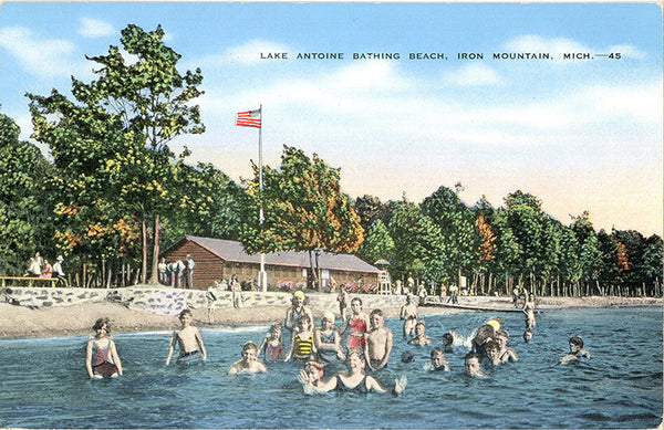 Vintage Michigan postcard showing people at Lake Antoine bathing beach in Iron Mountain.