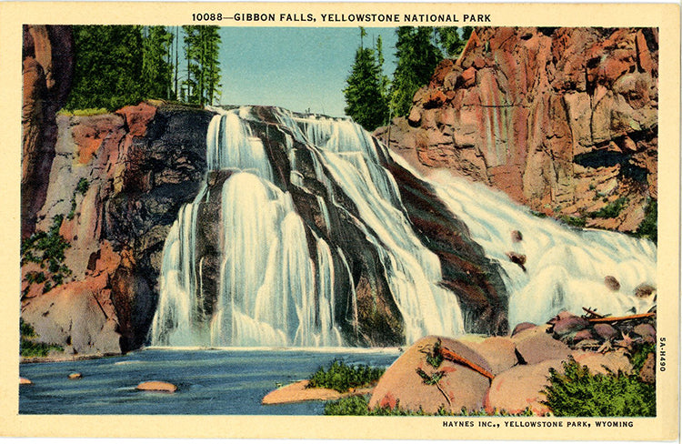 Vintage Wyoming postcard of the Gibbon Falls in Gibbon Canyon in Yellowstone National Park.